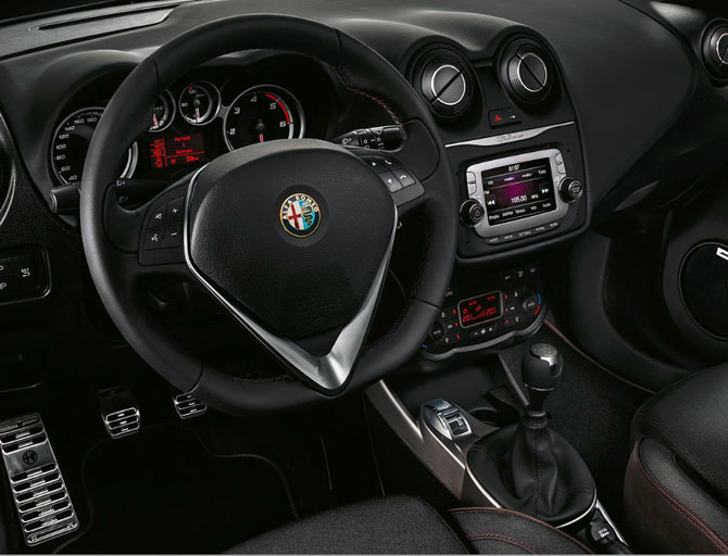 Ancora più forte la personalizzazione all’interno dove l’ambiente sportivo scuro viene impreziosito dai nuovi sedili in tessuto grigio ed ecopelle marrone dall’effetto vintage con cuciture in tono e scritta Alfa Romeo sui poggiatesta anteriori. Il rivestimento in pelle con cuciture marroni è riservato anche al volante sportivo tagliato con comandi radio, alla cuffia cambio e alla leva del freno di stazionamento.